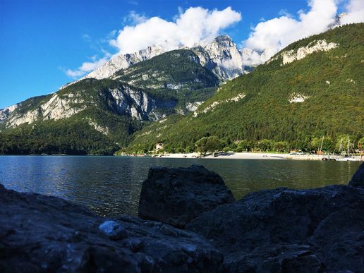 Als wir die Straße am See entlangfahren, sehen wir schon die gewaltigen Berge und die kleine Stadt Molveno, die zwischen der Brentagruppe und dem Paganellagebirge liegt. Der Molvenosee ist der größte natürliche Alpensee, liegt auf 800m Meereshöhe und ist 124 Meter tief. Zahlreiche Bäche und Flüsse münden in den von dichten Wäldern umgebenen See. Er lädt zum Angeln, Boot fahren, Baden, Tauchen, Wandern und verweilen ein.