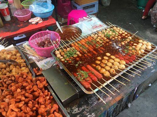 An unserem letzten Tag besuchen wir den Nachtmarkt „Tarad Rot Fi Train Night Market Ratchada“. Es ist voll und sieht leider nach Regen aus. Wir schlendern durch die kleinen Wege zwischen den zahlreichen Ständen und drängeln uns durch Menschenmassen. Hier wird entweder im Stehen gegessen oder man setzt sich Schulter an Schulter, wenn man denn einen Platz findet, an kleine Tische. Als wir eine große Portion Pad Thai essen, fängt es an zu regnen. Innerhalb 2 Minuten verwandeln sich die kleinen Wege zwischen den Ständen in rauschende Bäche und faustgroße Kröten kommen aus Ihren Löchern. Als es nach 10 Minuten nicht besser, sondern eher schlimmer wird, laufen wir in „Alles egal“-Stimmung los zur U-Bahn. Quer über den Markt, durch Pfützen, in denen wir bis zu den Schienbeinen versinken und vorbei an Ständen, die sichtbar mit dem Wasser zu kämpfen haben und versuchen ihre Waren zu schützen.