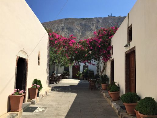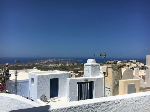 Wir landen auf dem kleinen Flughafen von Santorini. Das Wetter ist perfekt und wir sind auch sofort in Urlaubsstimmung. Der Bus bringt uns nach Perissa, wo wir in unserer kleinen und gemütlichen Unterkunft einchecken. Schon auf der Fahrt sehen wir überall die weißen Häuser mit den typisch dunkelblauen Fenstern, Türen und Dächern.