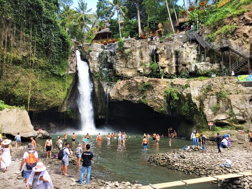 Wir zahlen auch hier 20.000 IDR (ca. 1 €) und steigen viele, sehr viele, unterschiedlich hohe Stufen hinab, bis wir endlich vor dem Tegenungan stehen. Wenn man sich mal die ganzen Menschen wegdenkt, ist es traumhaft. Florian klettert nochmal eine Ebene höher, um dort die Drohne steigen zu lassen. Dafür muss er erneut 20.000 IDR bezahlen. Naja, so ist das hier nun einmal. Oben angekommen ist der Ausblick einfach super. Leider sind oben große Restaurants, die mit lauter Bumbum-Musik die Ruhe zerstören. Touristen stehen Schlange für die Palmenschaukel, die erneut 20.000 IDR kosten soll und Menschenmassen tummeln sich im und am Pool.