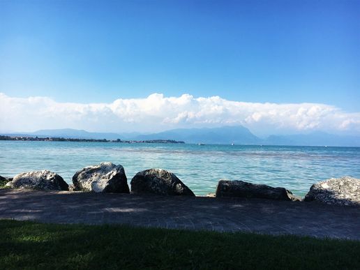 Doch nun sind wir erstmal in Garda angekommen. Das Auto konnten wir ziemlich nah am Wasser parken und müssen somit nicht noch einen langen Marsch hinlegen. Da die Bullenhitze uns die Haarspitzen verkokelt, legen wir uns direkt am Wasser unter einen Baum und genießen den Schatten und den Blick auf den See. 10 Minuten später werden wir höflich von einer Dame in Uniform gebeten die Rasenfläche zu verlassen, da "Herumlungern" nicht gestattet ist.